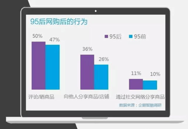 95后爱买东西,更爱晒东西。调查显示,收到商品并不代表网购的结束,有50%的95后会晒出或者评论商品。95后热衷于给周围朋友“种草”,有36%的人愿意向他人分享商品和店铺,这要比95前多出10个百分点。